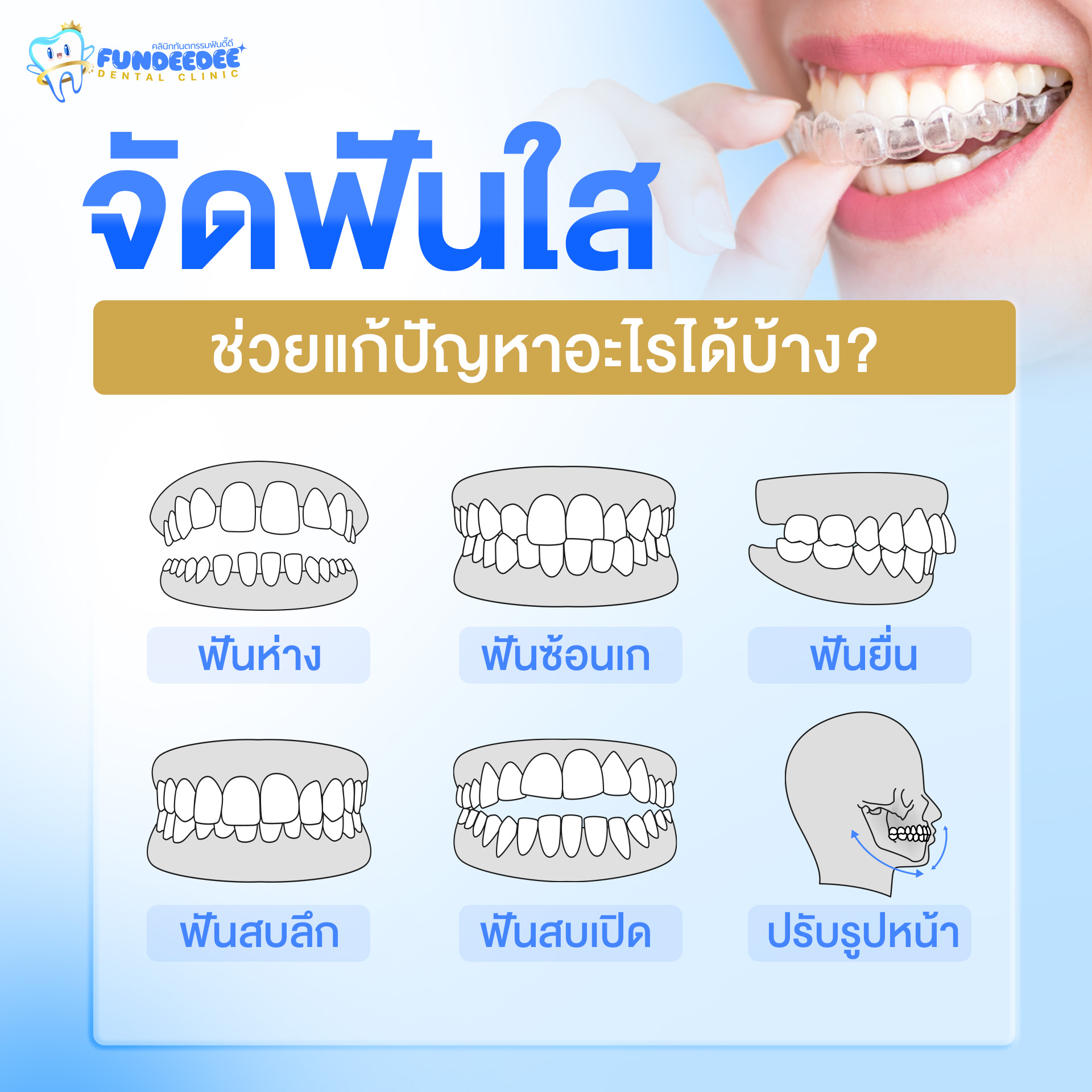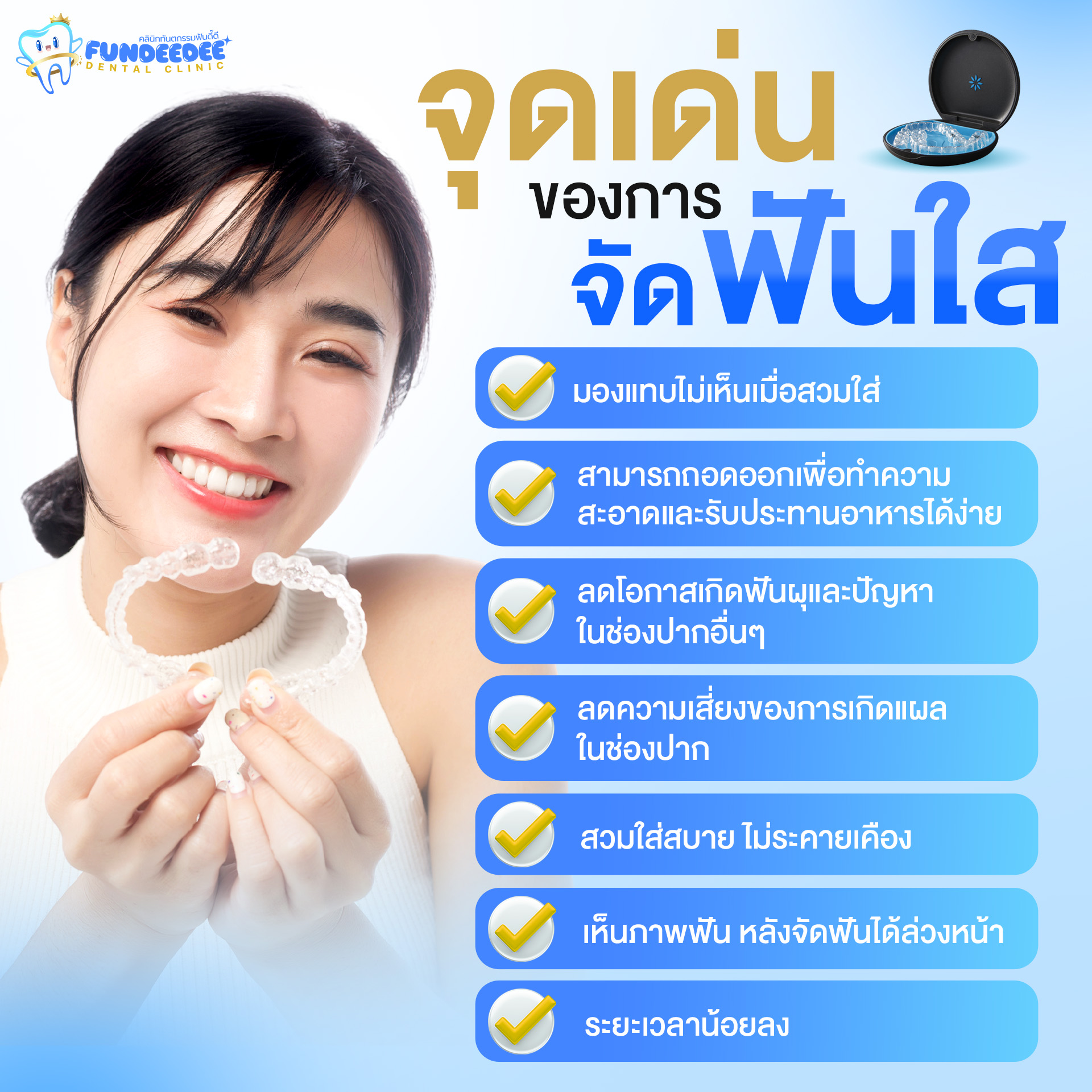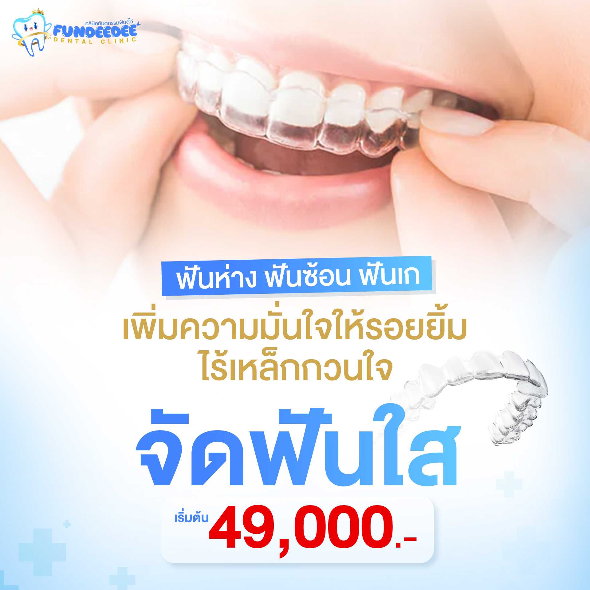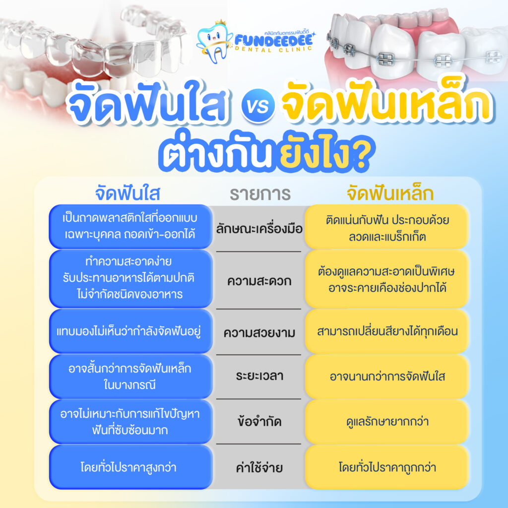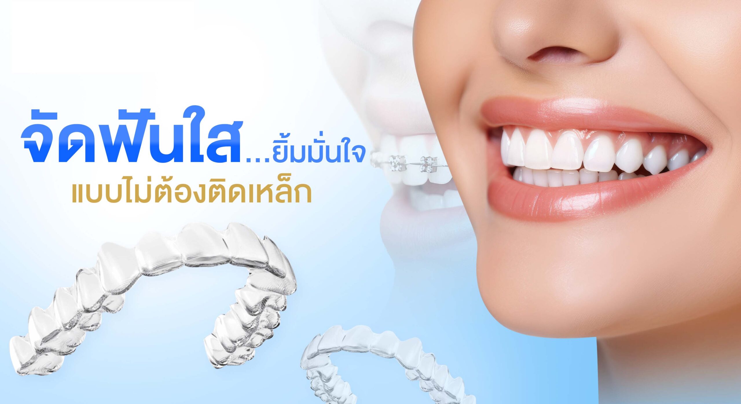 จัดฟันใส (Clear Aligner) คือการจัดฟันแบบไม่ต้องใช้เหล็ก ไม่ต้องติดเครื่องมือโลหะบนฟัน แต่ใช้ “ชุดเครื่องมือใส” ที่ออกแบบมาเฉพาะบุคคล เพื่อค่อยๆ ขยับฟันไปในทิศทางที่ต้องการ